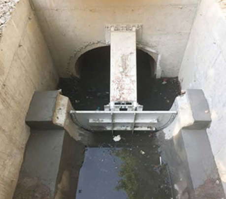 利用攔蓄盾對管道水流進行攔蓄,攔蓄管道水流工程中、不鏽鋼材料製成的鉛封與攔蓄門保持嚴密閉合,防止攔蓄水的滲漏。依據原有排水管道參數確定攔蓄門的規格及井室尺寸,超聲波液位儀安裝於攔蓄截斷麵的上部,用於檢測攔蓄水水位和出水水位。